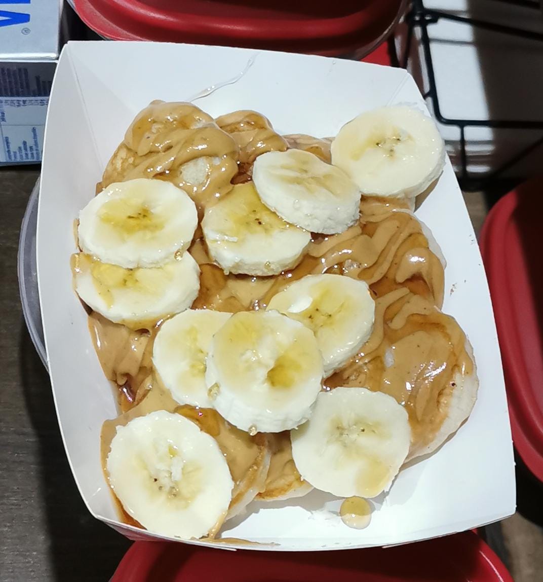 12 Piezas con crema de cacahuate, miel maple y plátano.