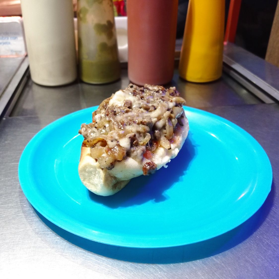 Salchicha, carne a elegir, queso mozzarella, cebolla asada y aderezos.