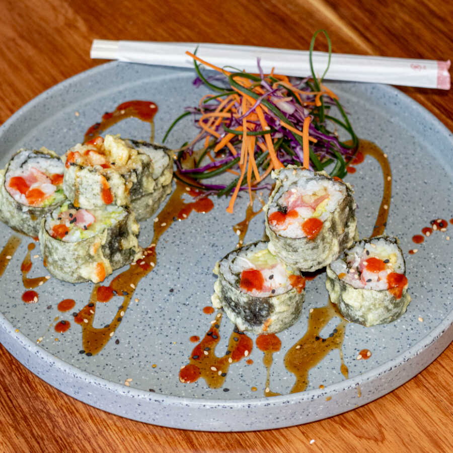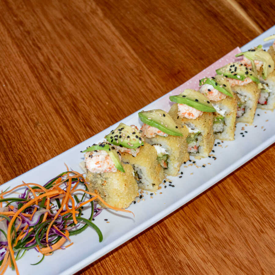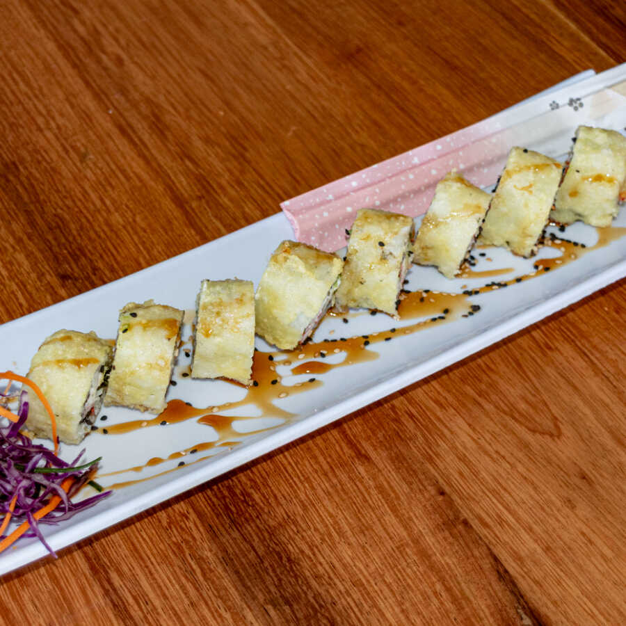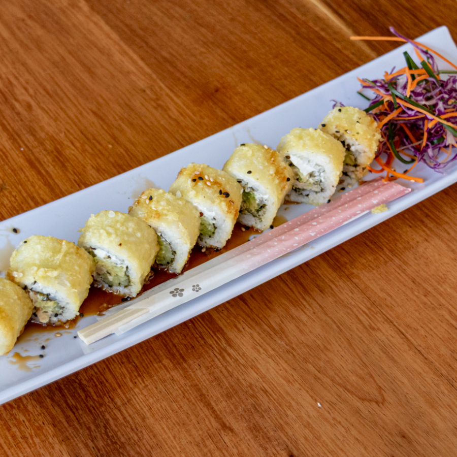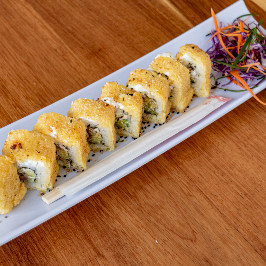 Por dentro: Atún, camarón, aguacate, pepino y queso crema, empanizado con queso manchego y queso americano.