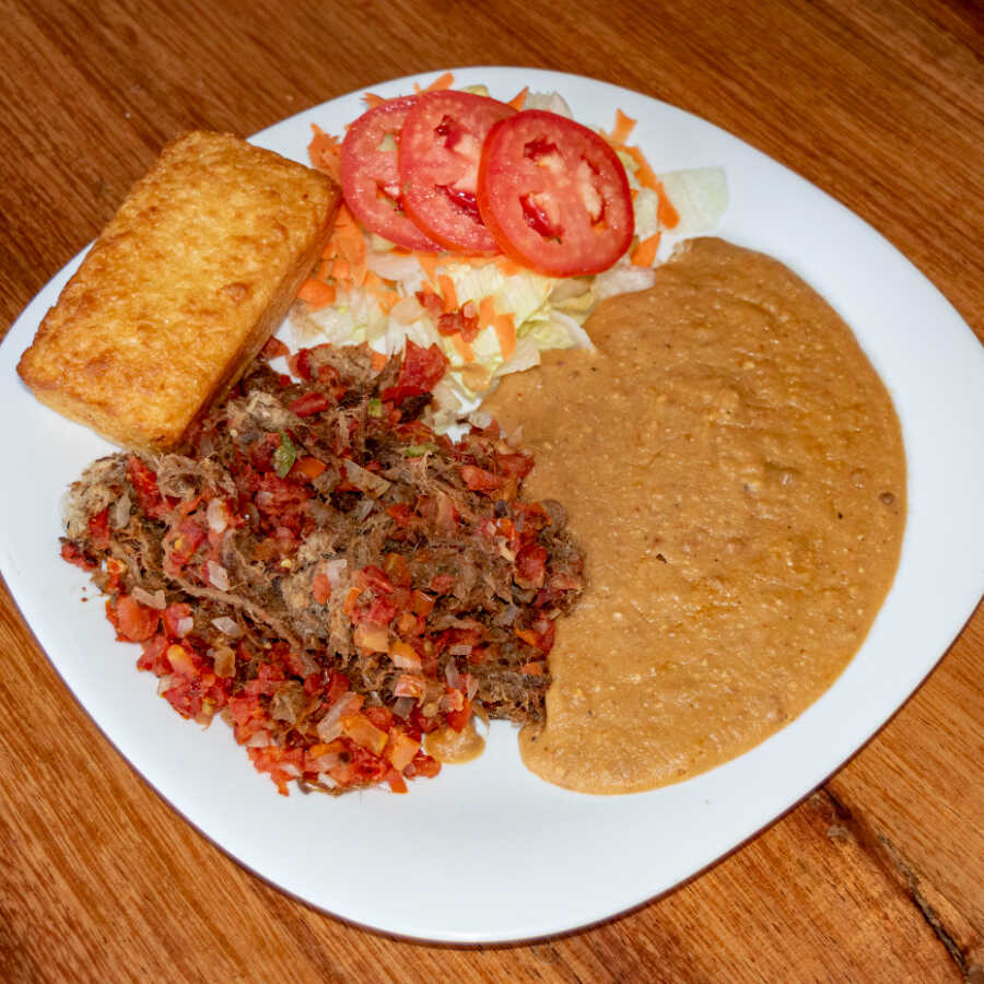 Machaca Ranchera acompañada de frijoles y ensalada.