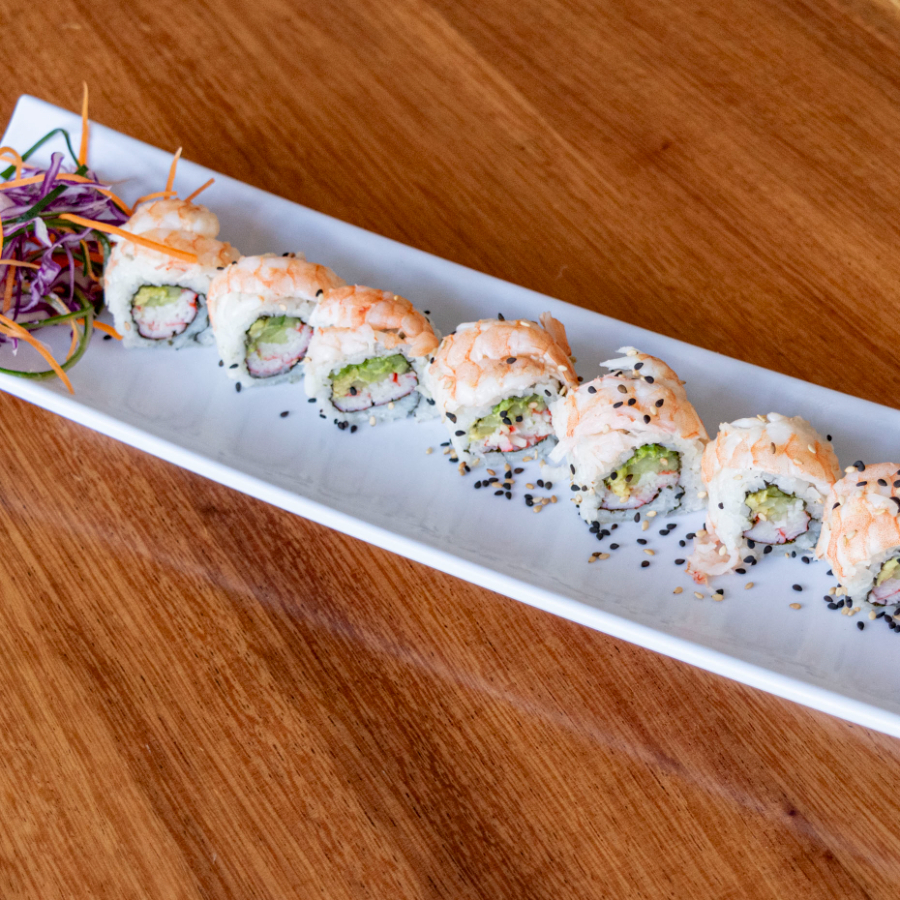 Por dentro: aguacate, pepino, cangrejo picante. Por fuera: Cubierto de camarón