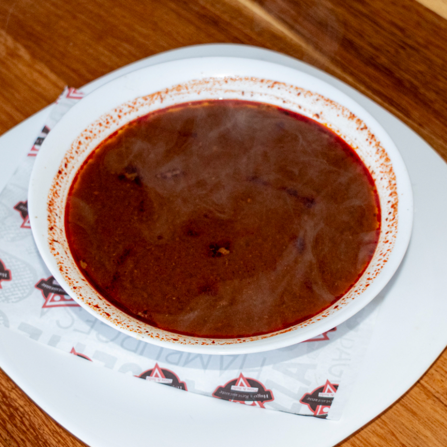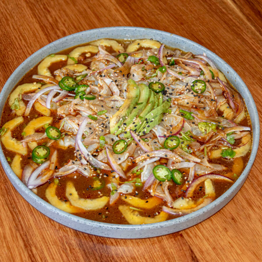Consome de res, cuadros de queso fresco, aguacate, cebolla, cilantro y media crema.