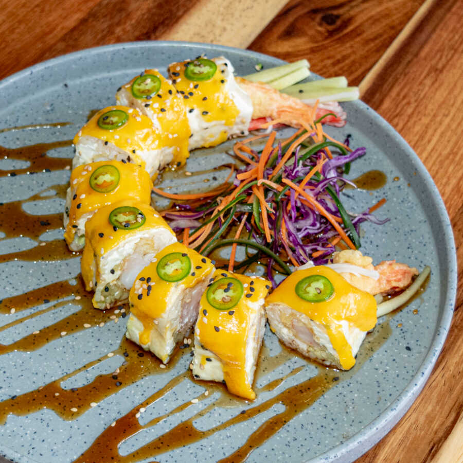 Por dentro: Aguacate, pepino, cangrejo picante, Philadefia y camarón tempura Por fuera: cubierto de mango, lamina de chile serrano y salsa anguila.
