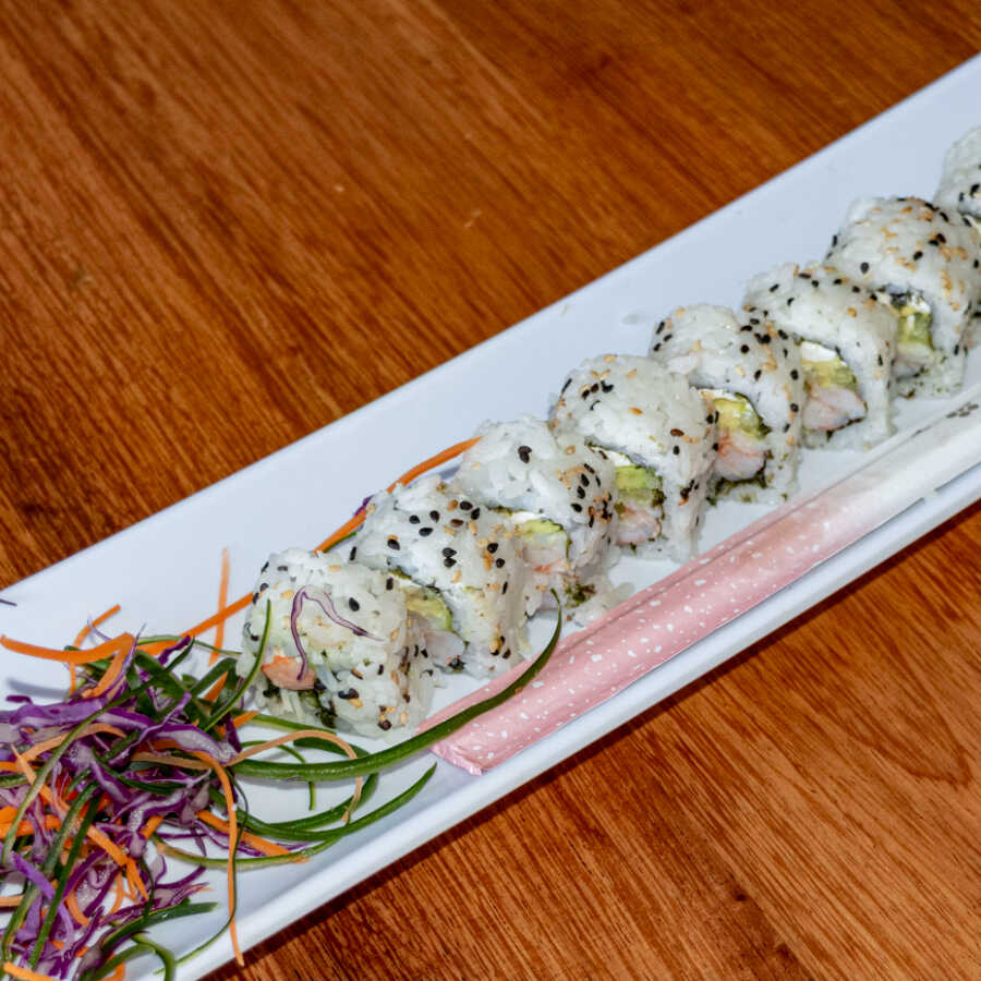 Por dentro: Pepino, aguacate, camarón y queso crema. Por fuera: Ajonjoli
