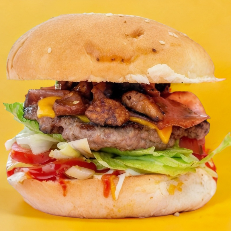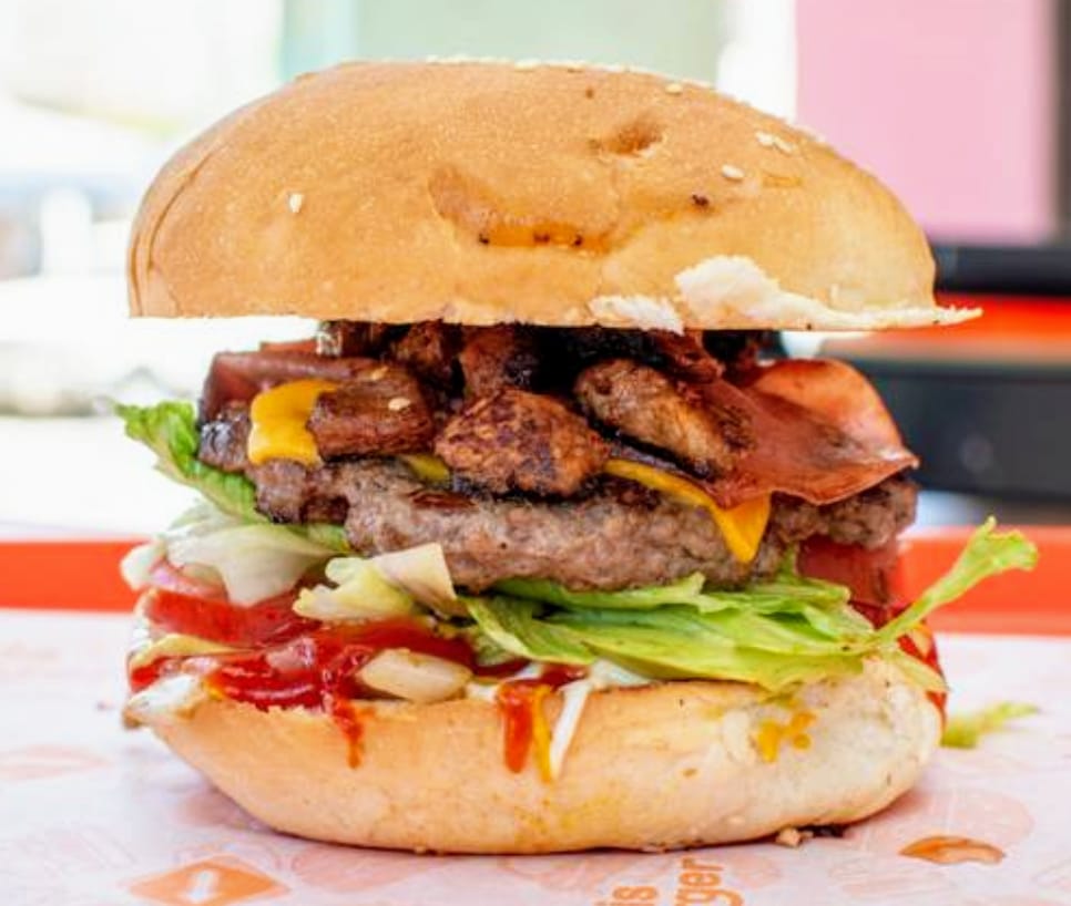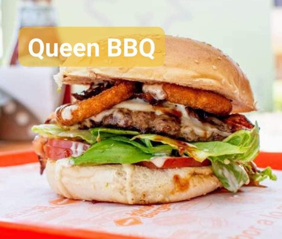 Carne de res, salsa bbq, aros de cebolla, mozzarella, tocino, aderezo queen.