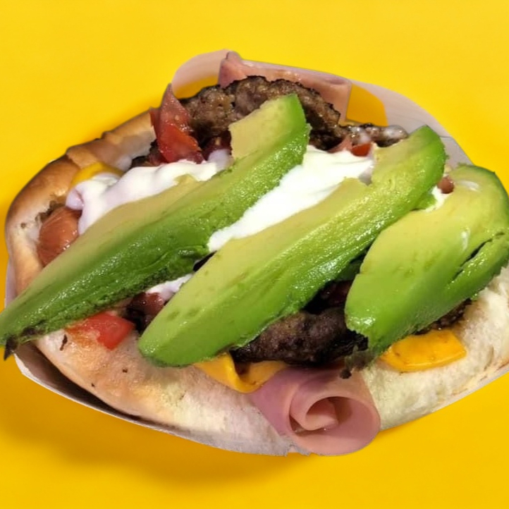 Salchicha, tomate, cebolla jamon, queos amarillo, aguacate, carne de hamburguesa