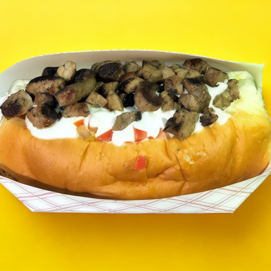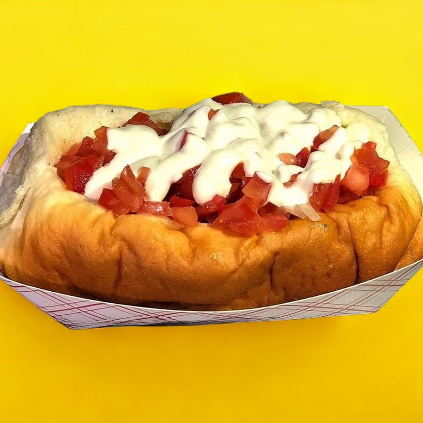 Salchicha carne asada, con Pan de trigo, Junto Aderezo y Salsa de tomate, cebolla.