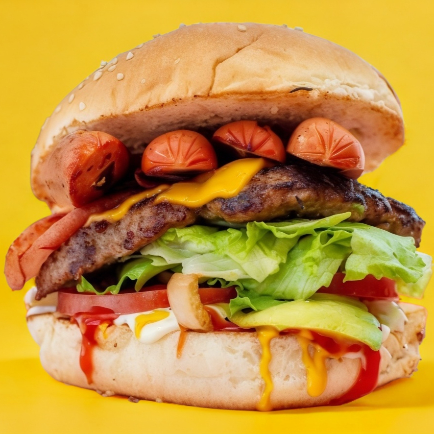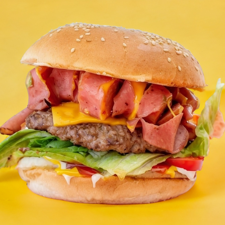 Carne de res, doble queso amarillo, doble jamón, salchicha.