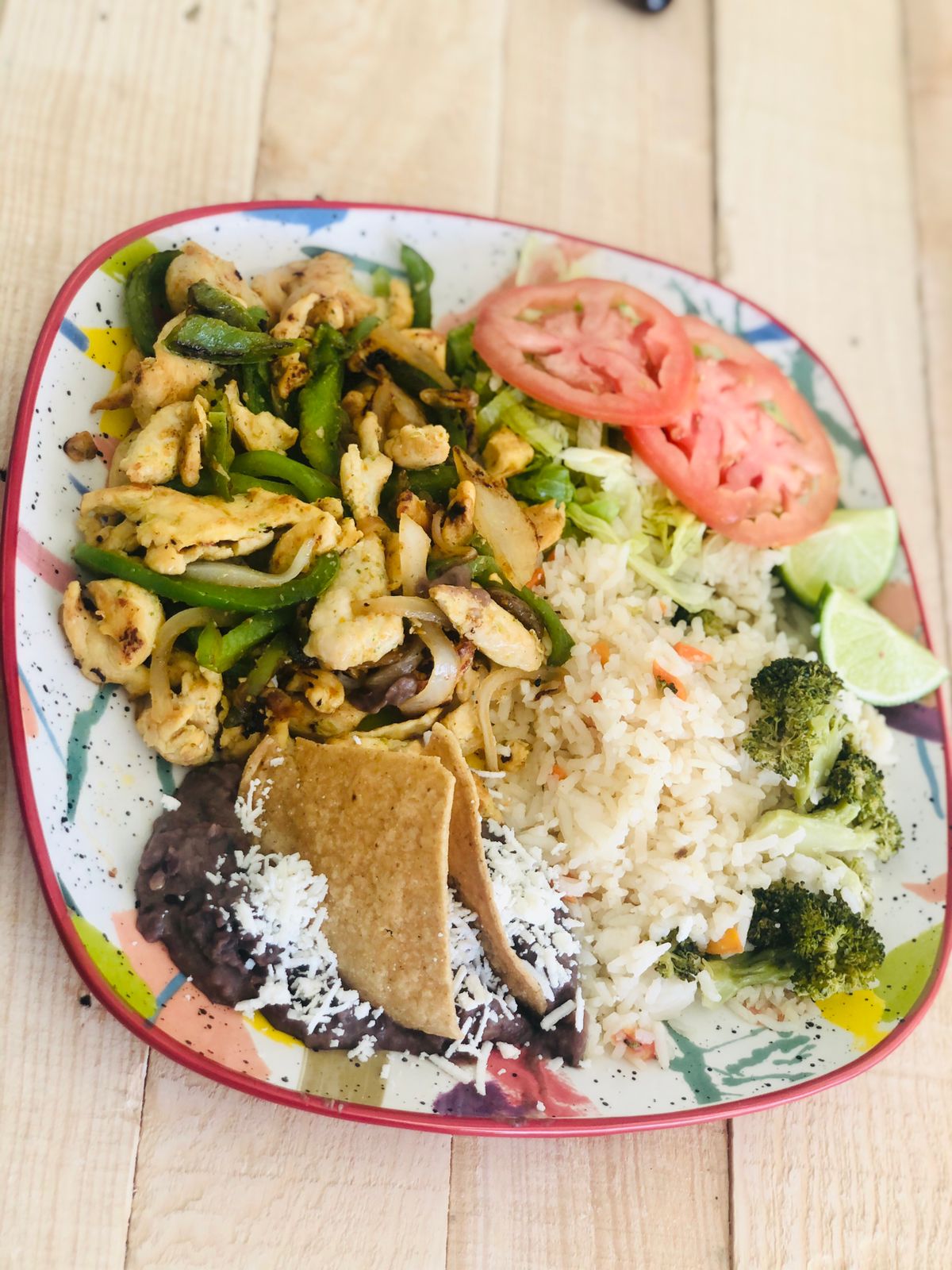 Tiras de pollo, guisadas con pimiento morrón y cebolla, acompañadas de espagueti, frijoles, ensalada y tortillas