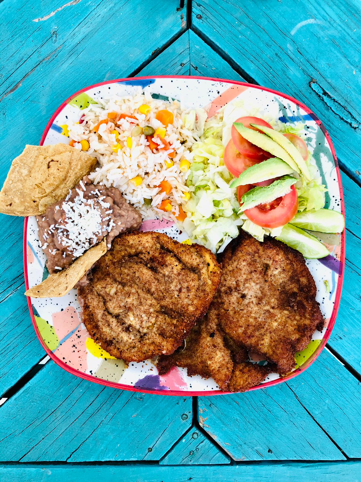 Filete de pechuga de pollo empanizado, acompañado de espagueti rojo, frijoles, ensalada y tortillas