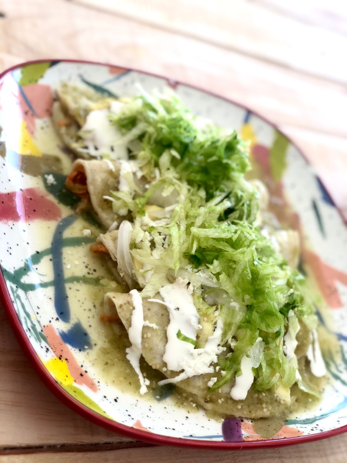 4 tortillas rellenas de pollo, cubiertas con salsa a elegir, queso derretido, lechuga, crema y quesito rayado