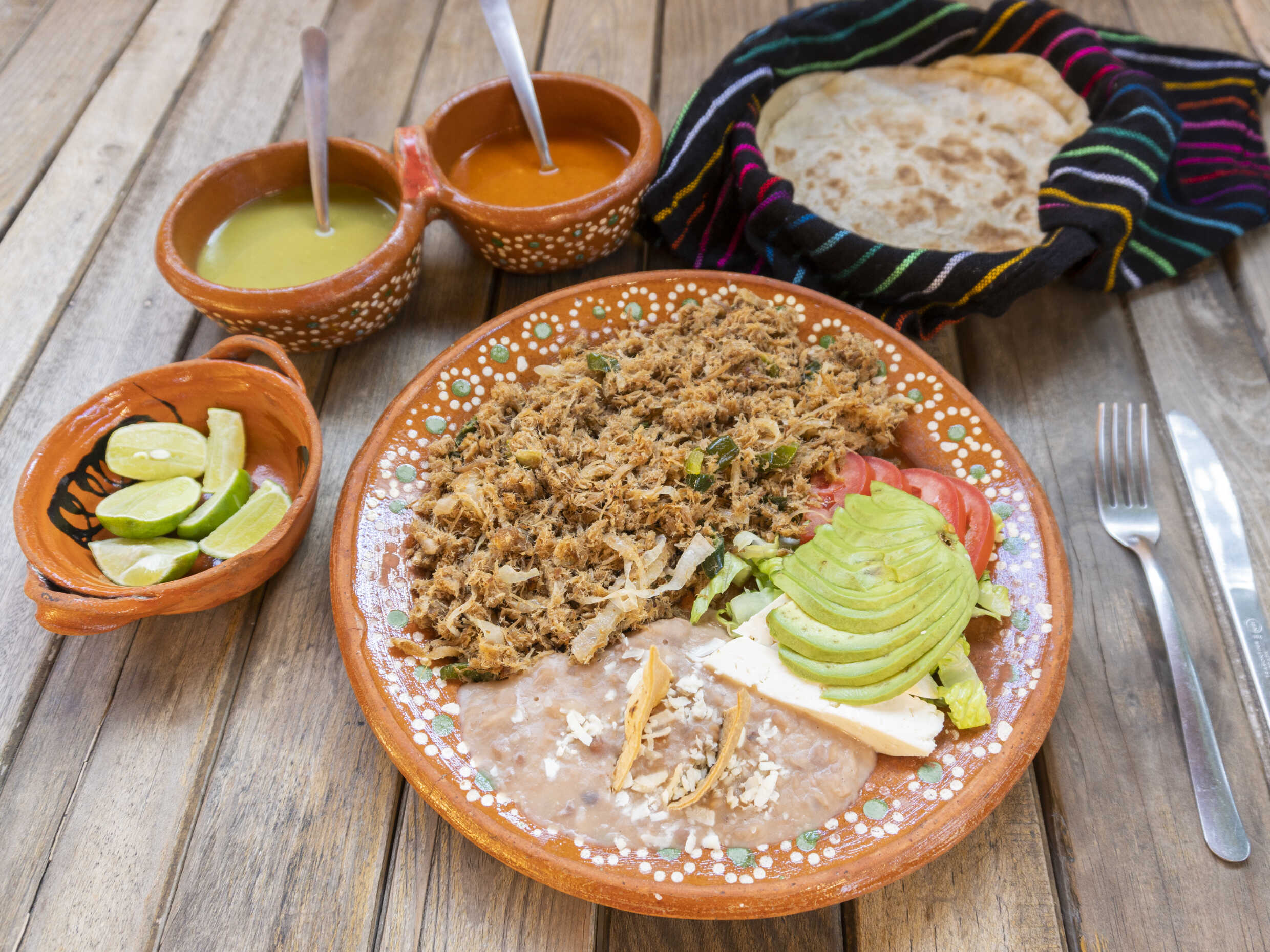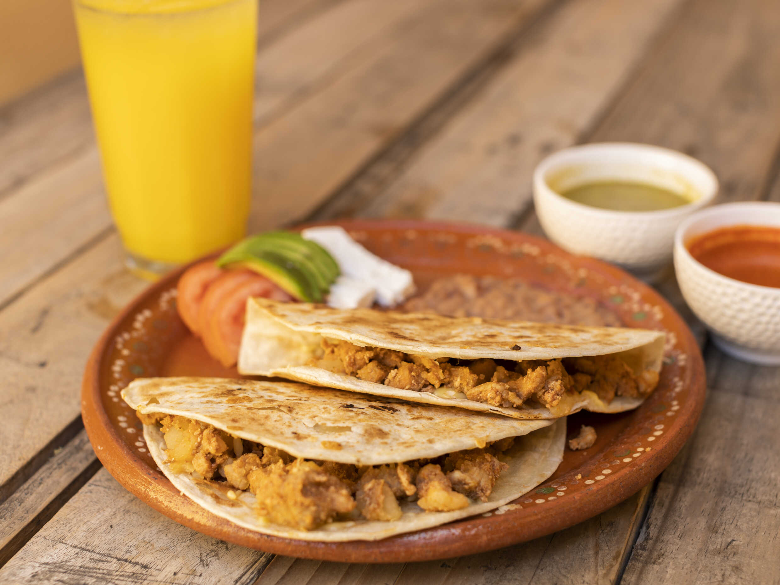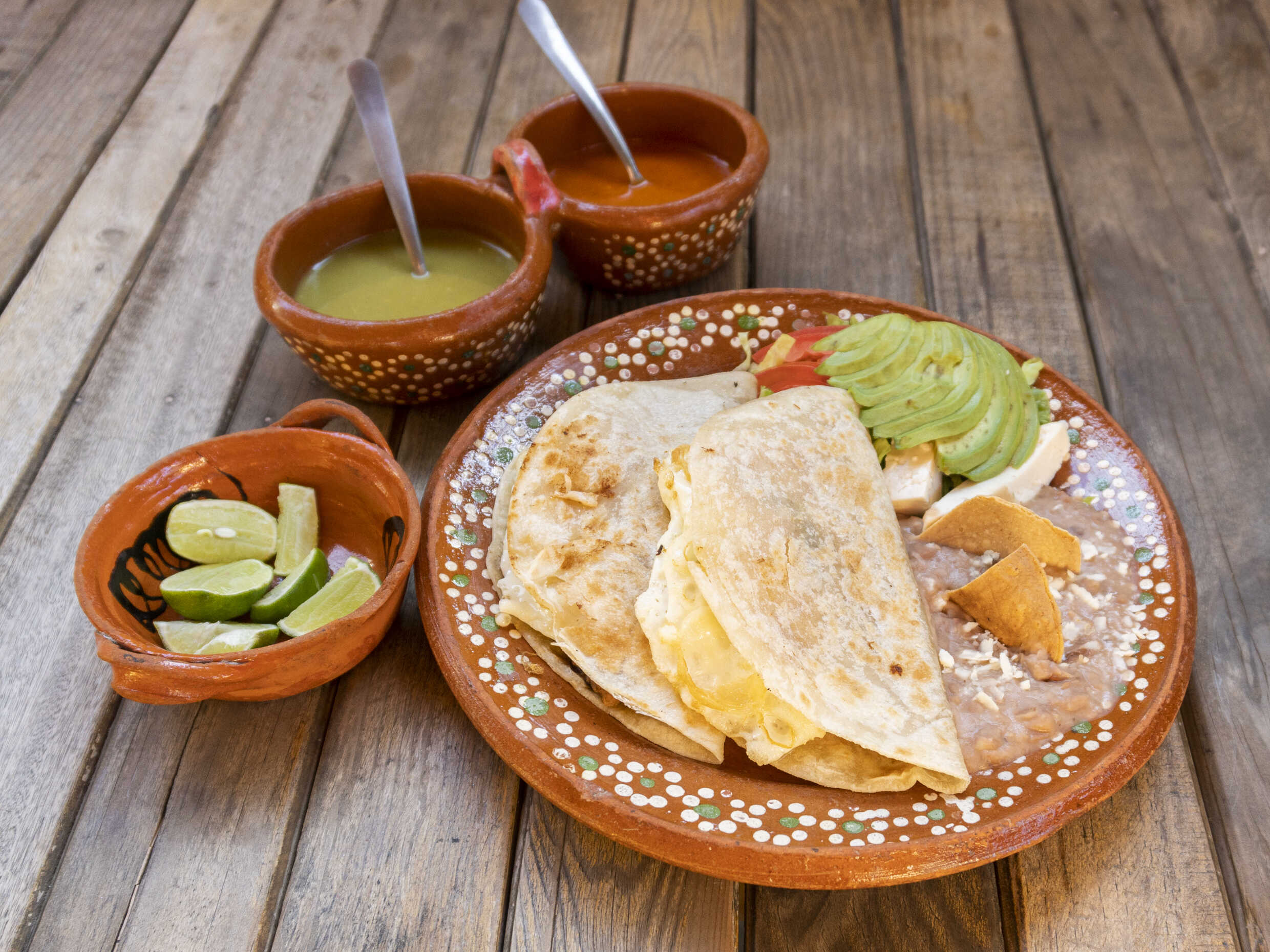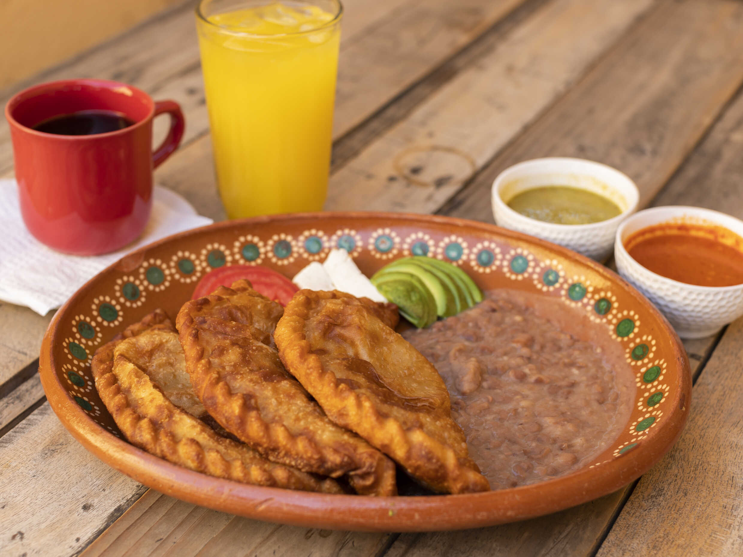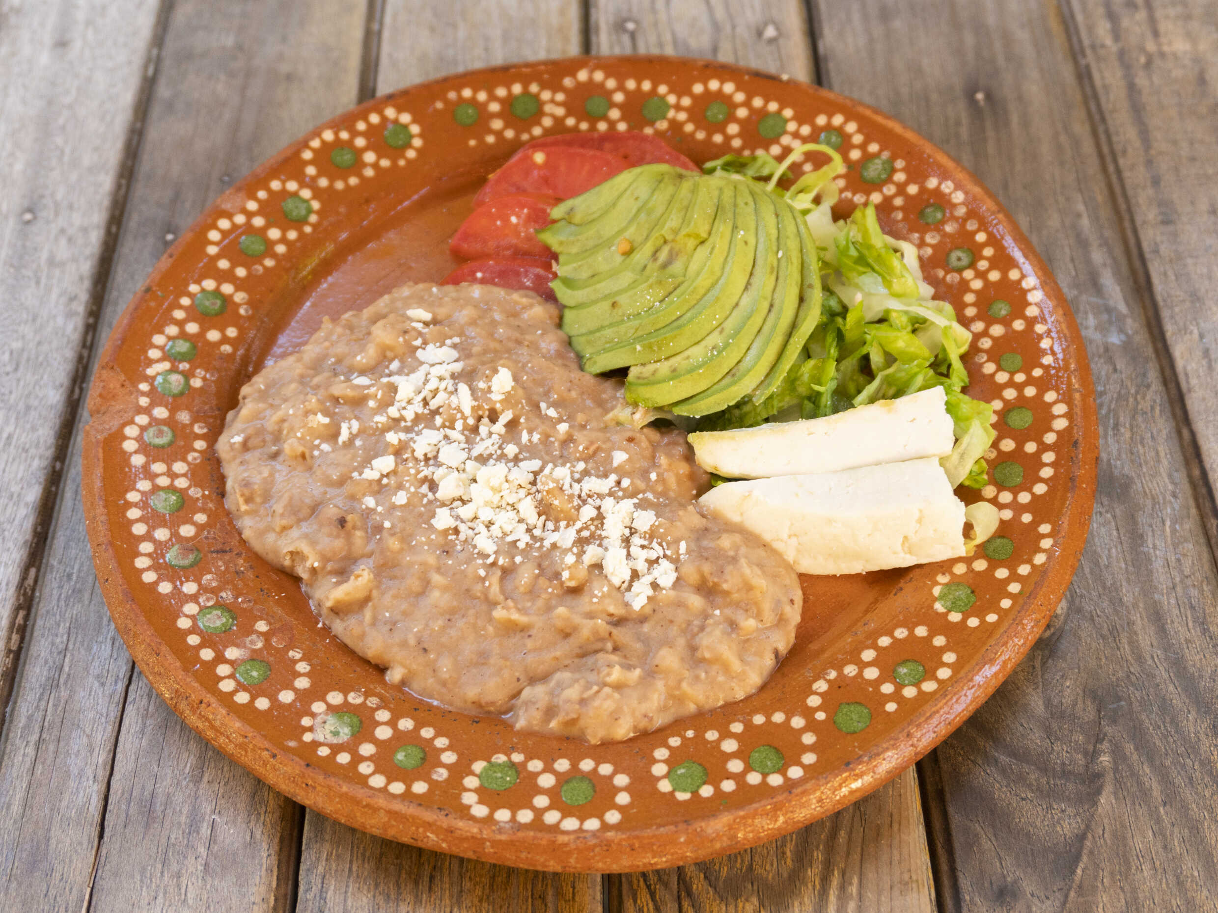 (Aguacate, tomate, queso fresco y frijoles refritos)