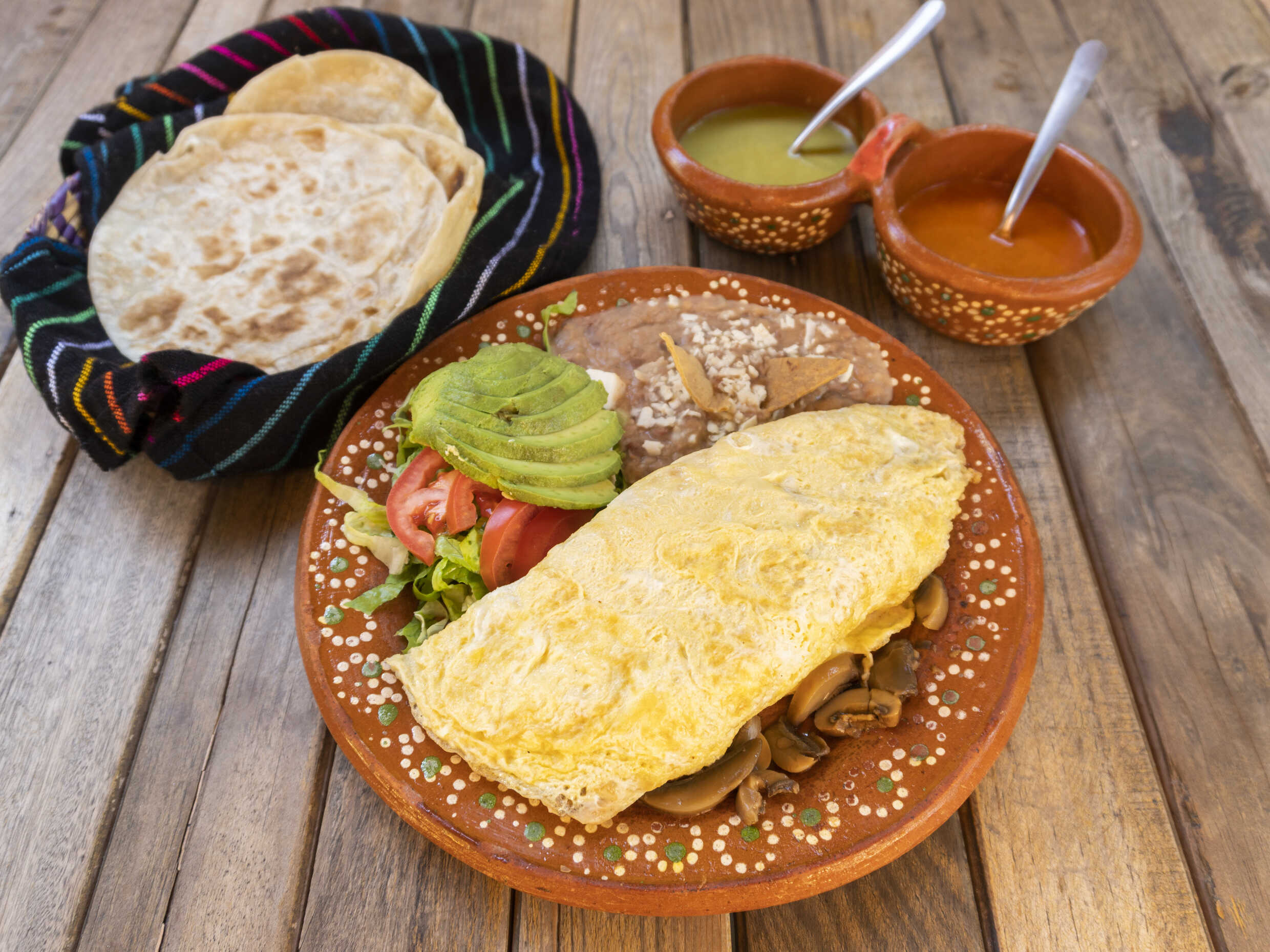 Omelette relleno con queso para gratinar, jamón, queso amarillo, Machaca, Deshebrada, Bistec y Chorizo, acompañado con su guarnición de aguacate, tomate, queso fresco y frijoles refritos