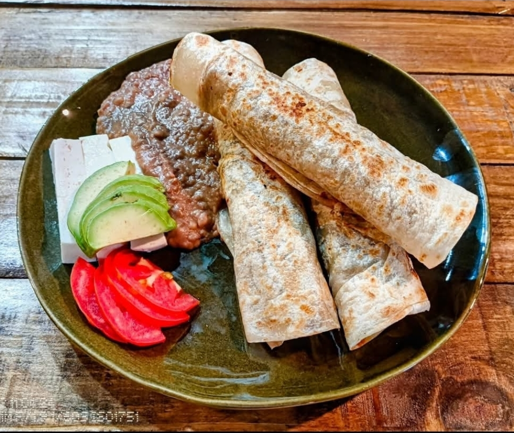 Tortilla de harina cacheteada con frijoles refritos, queso manchego gratinado, queso amarillo tipo americano, jamón frito y vegetales
