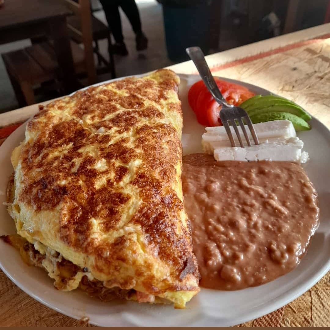 Torta de huevo con queso blanco gratinado,queso amarillo, jamón, salchicha, un poco de todos nuestros guisos a excepción de pescado ahumado, acompañado de frijoles refritos, queso fresco, tomate, aguacate y tortillas . 1/2 orden (4 huevos) o completa (5 huevos), Desayuno para 2 ó 3 personas.