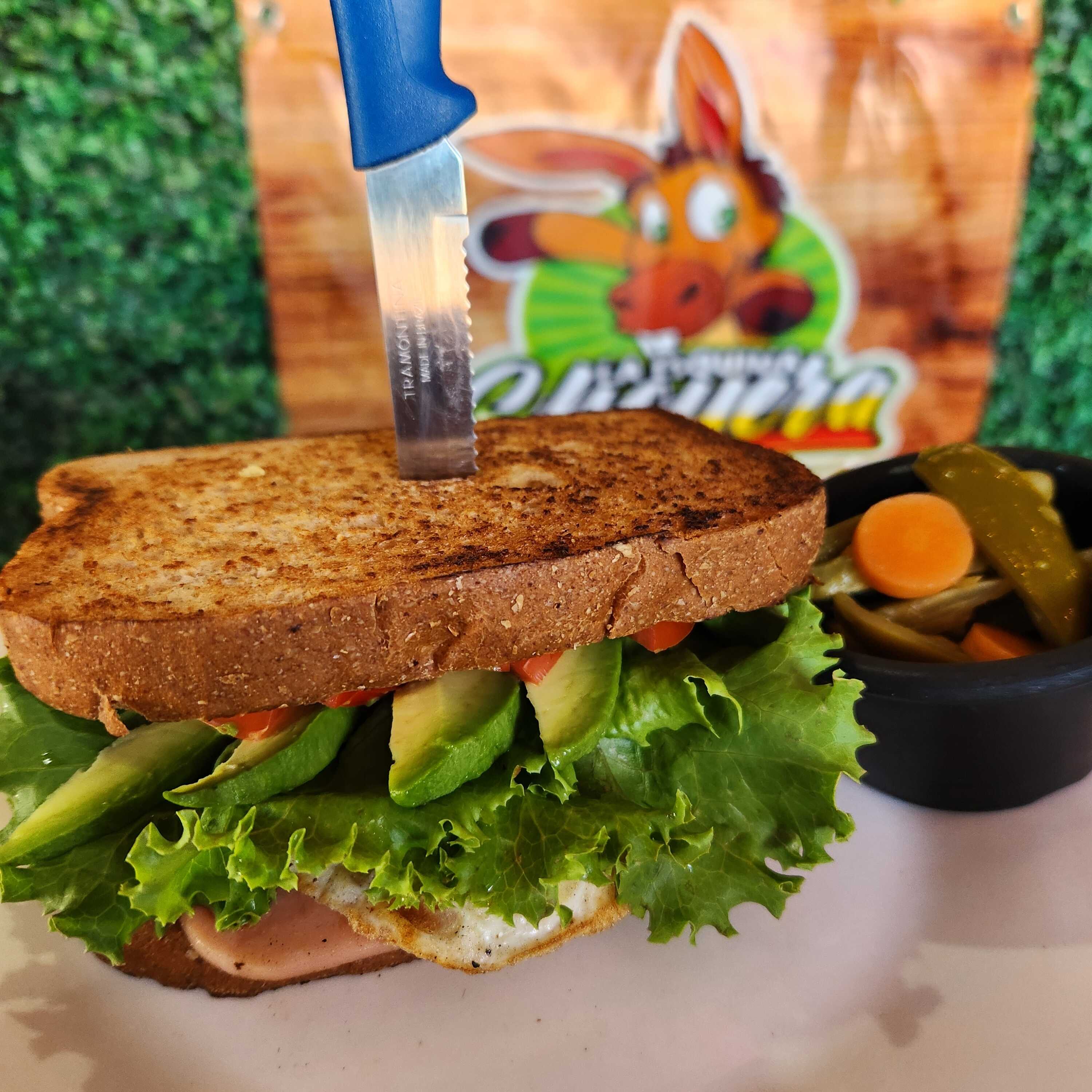 Pan integral multigrano, jamón de pavo, queso fresco, queso americano, queso manchego Gratinado, huevo estrellado (termino a elegir), y vegetales