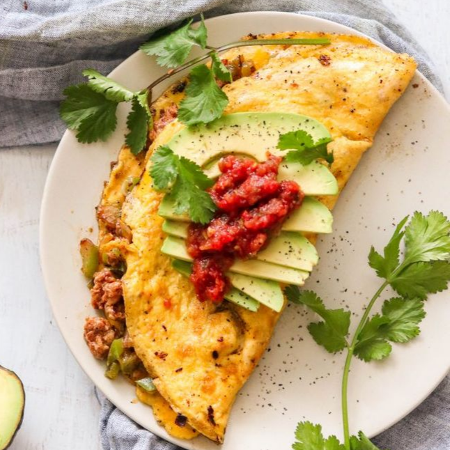 Tortilla de huevo con machaca a la mexicana y queso gratinado, acompañado de frijoles y ensalada.