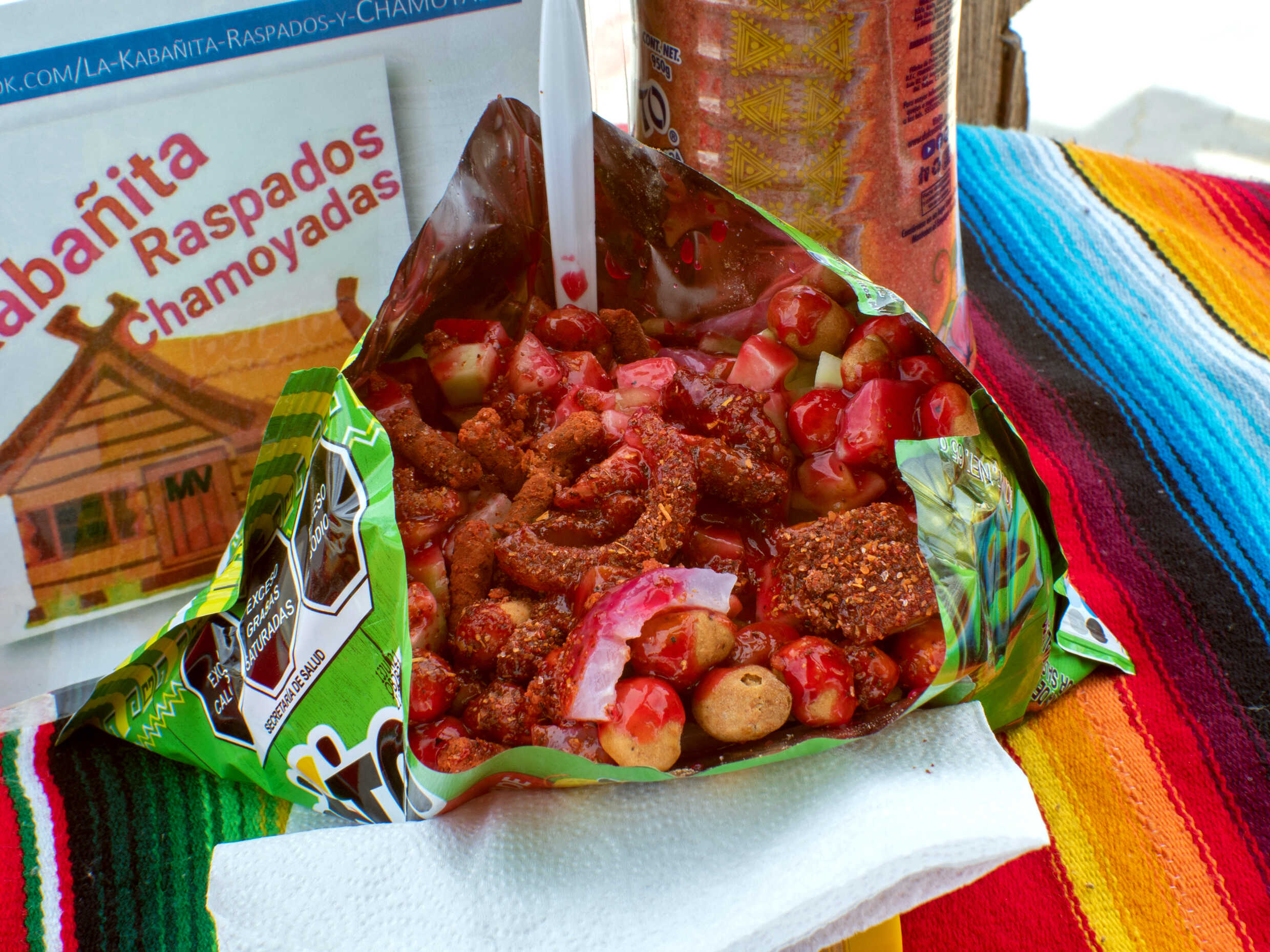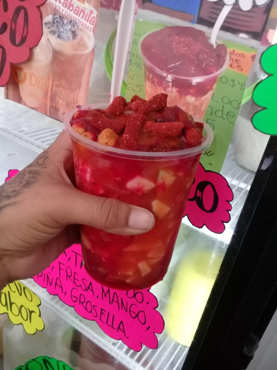 Pepino, jícama, clamato, cueritos, cacahuate, chacatrozo, chamoy, salsa Valentina, chile en polvo. Y claro.