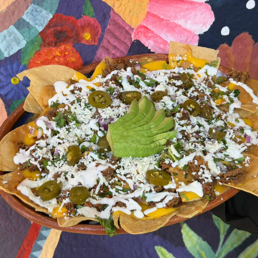 TOTOPOS CRUJIENTES BAÑADOS DE FRIJOLES, QUESO AMARILLO, CREMA, CEBOLLA, CILANTRO, BIRRIA Y CHILES JALAPEÑOS.