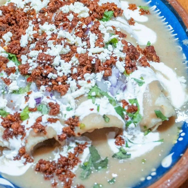 TORTILLAS HECHAS A MANO RELLENAS DE POLLO, BAÑADAS EN SALSA DE FRIJOL, CEBOLLA, CILANTRO, CREMA , CHORIZO Y AGUACATE