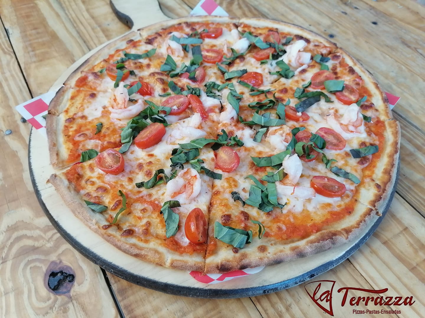 Camarón, pollo, res, tomate cherry y albahaca.
