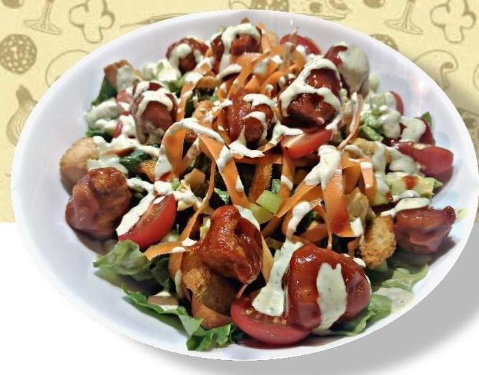 Cama de lechugas mixtas, pepino, aguacate, tomate cherry, crutones, zanahorias, 220grs de boneless con salsa a tu elección.