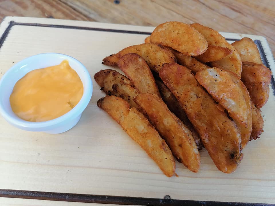 Papas sazonadas con queso amarillo, ranch, catsup, tocino dorado y cebollín.