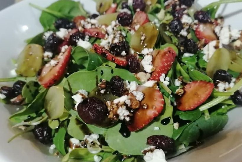 Espinaca, arúgula, fresa, uva, nuez caramelizada y arándanos.