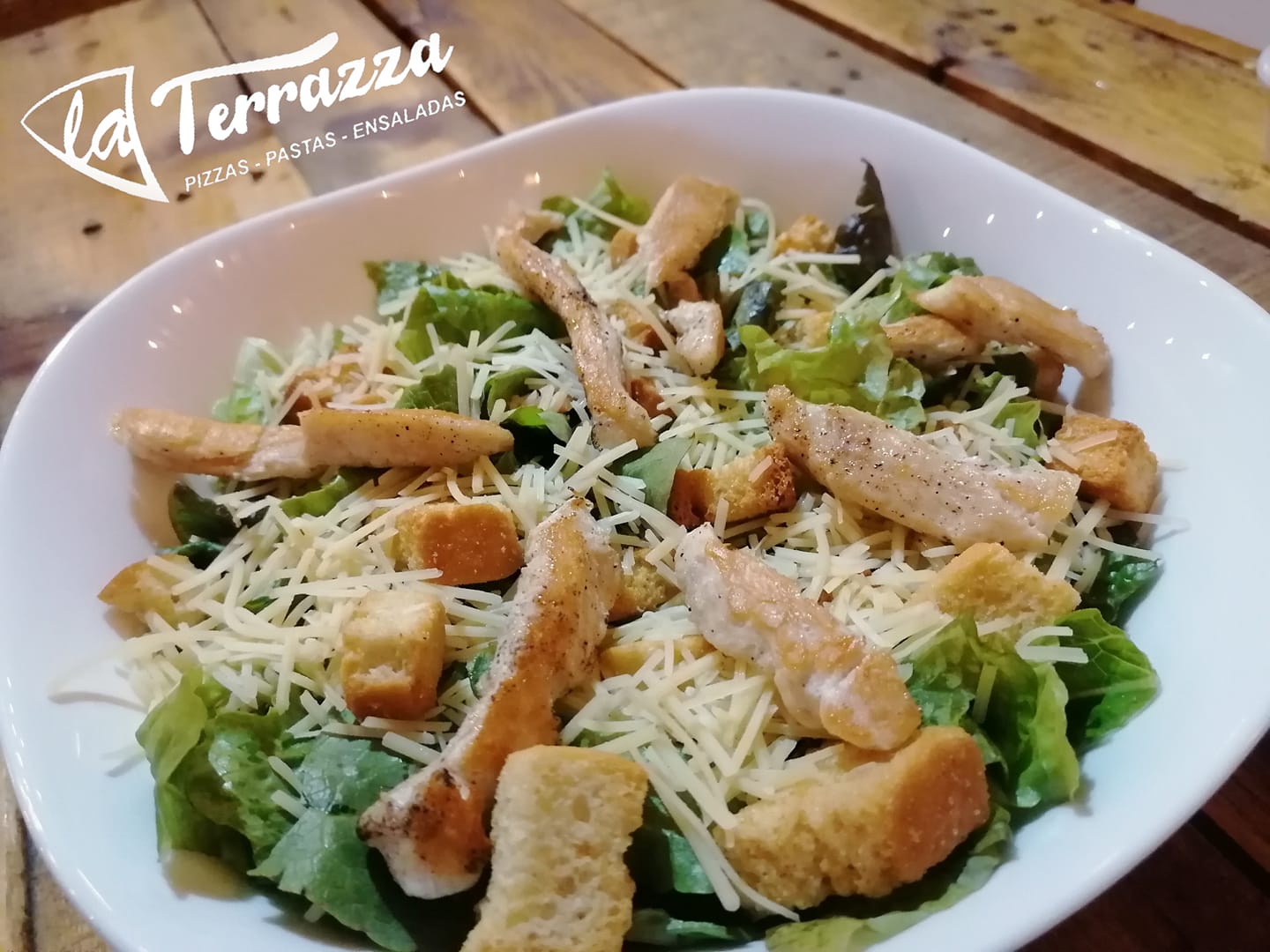 Lechuga romana, pollo, queso parmesano, crutones y aderezo.
