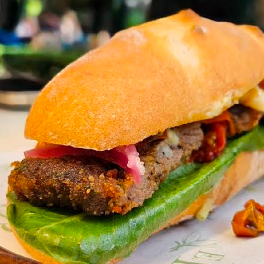 Milanesa de res, queso manchego, lechuga italiana, jitomate, cebolla, pepino, mayonesa, salpimentado.