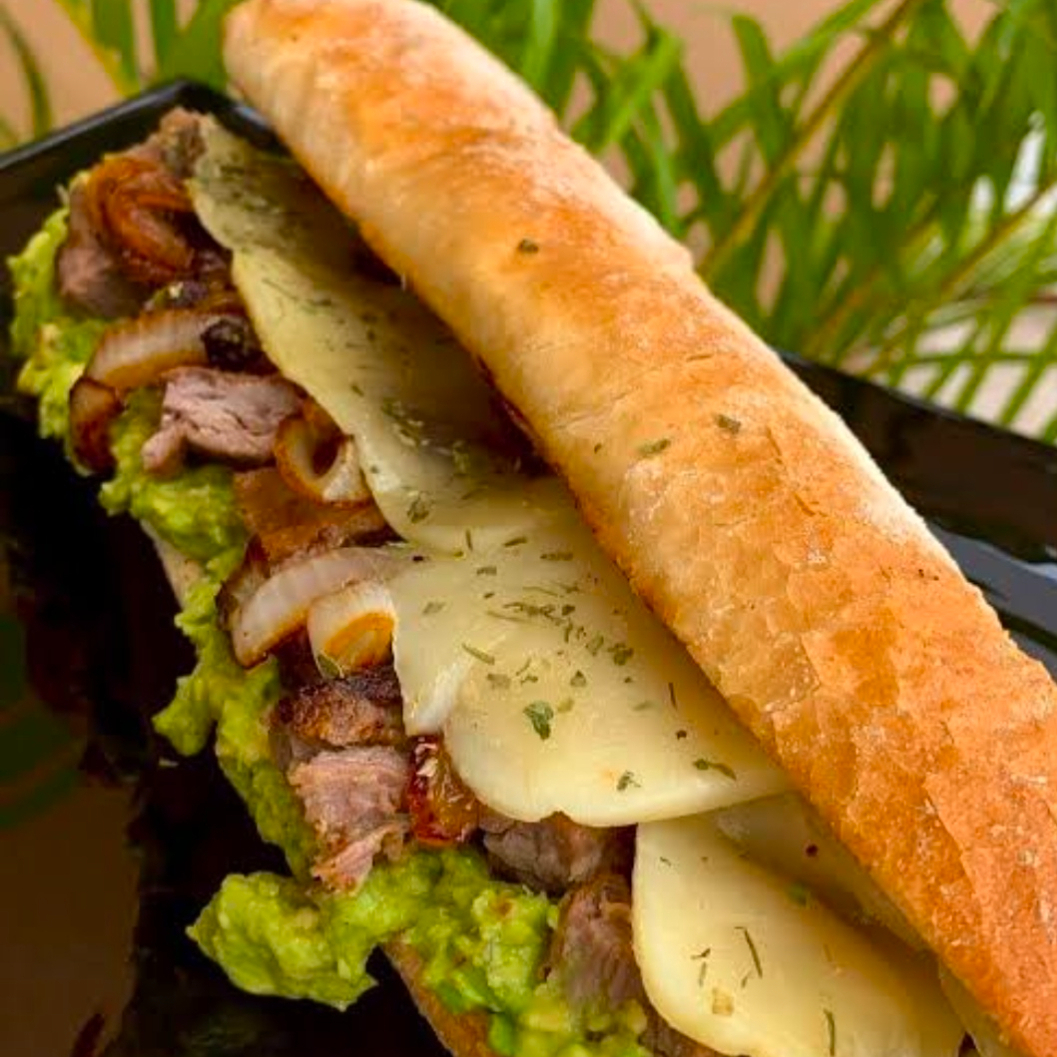 Arrachera marinada, chimichurri, mayonesa, lechuga italiana, jitomate, cebolla, salpimentado.