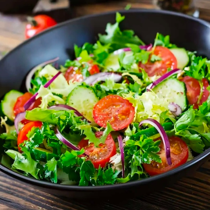 Lechuga italiana, jitomate, cebolla morada, pepino, aceituna, salpimentado y aderezo a elegir.