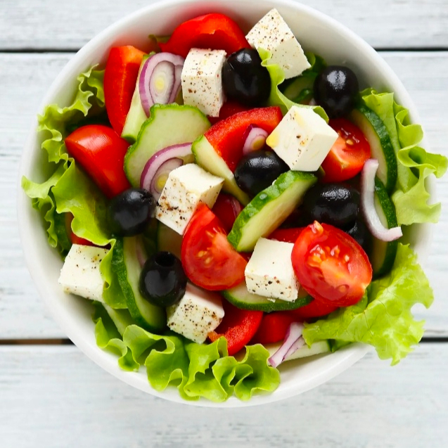 Queso panela, lechuga italiana, jitomate, cebolla morada, pepino, aceituna, salpimentado y aderezo a elegir.