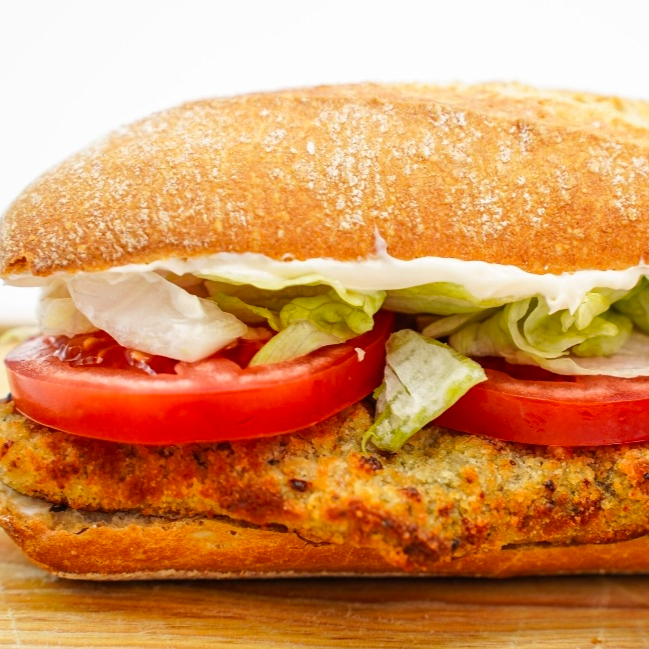 Milanesa de pollo, queso manchego, lechuga italiana, jitomate, cebolla, pepino, mayonesa, salpimentado.