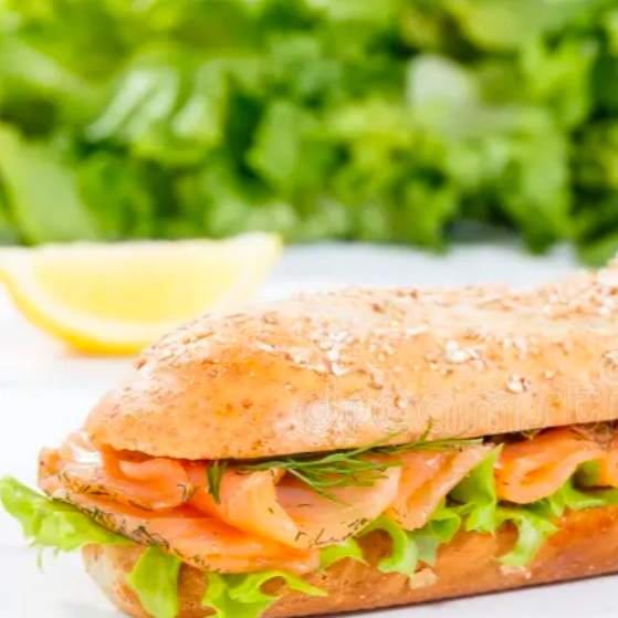 Salmón ahumado, chimichurri, mayonesa, aceituna, lechuga italiana, jitomate, cebolla, salpimentado.