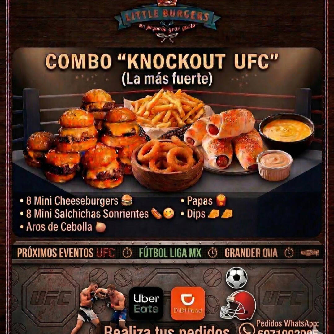 8 mini chees burgers + 8 mini salchichas sonrientes + aros de cebolla + papas a la francesa + dip de queso cheddar