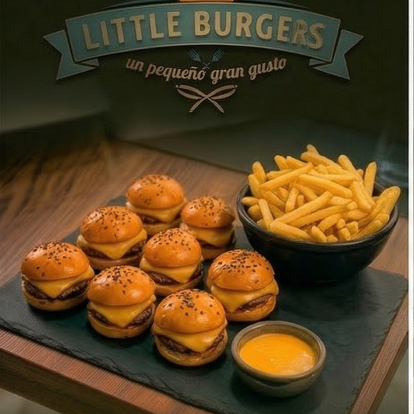 8 mini cheese burgers + 240 gr de papas a la francesa + dip de cheso cheddar