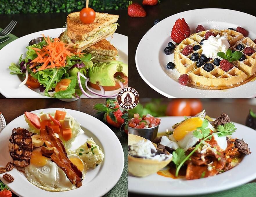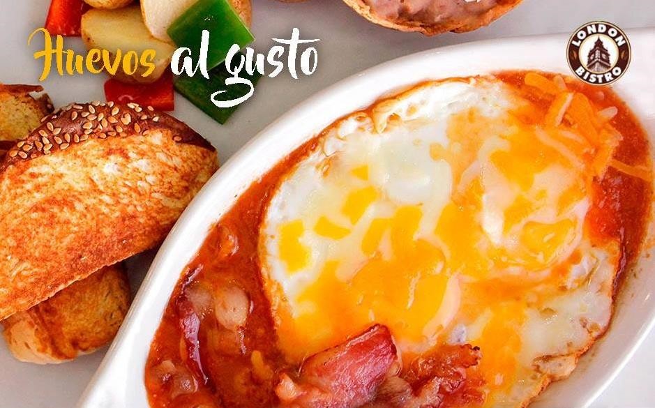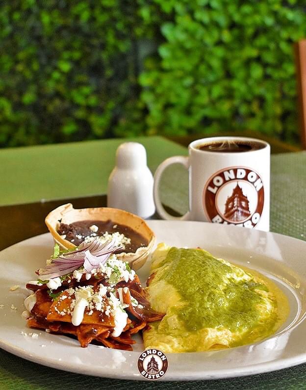 Pechuga de pollo a las hierbas finas, crocante tocino, rajas poblanas, queso oaxaca, cebolla blanca y bañado con salsa london (cremosa salsa al chipotle). Se acompaña con chilaquiles en salsa london o fresca ensalada verde.