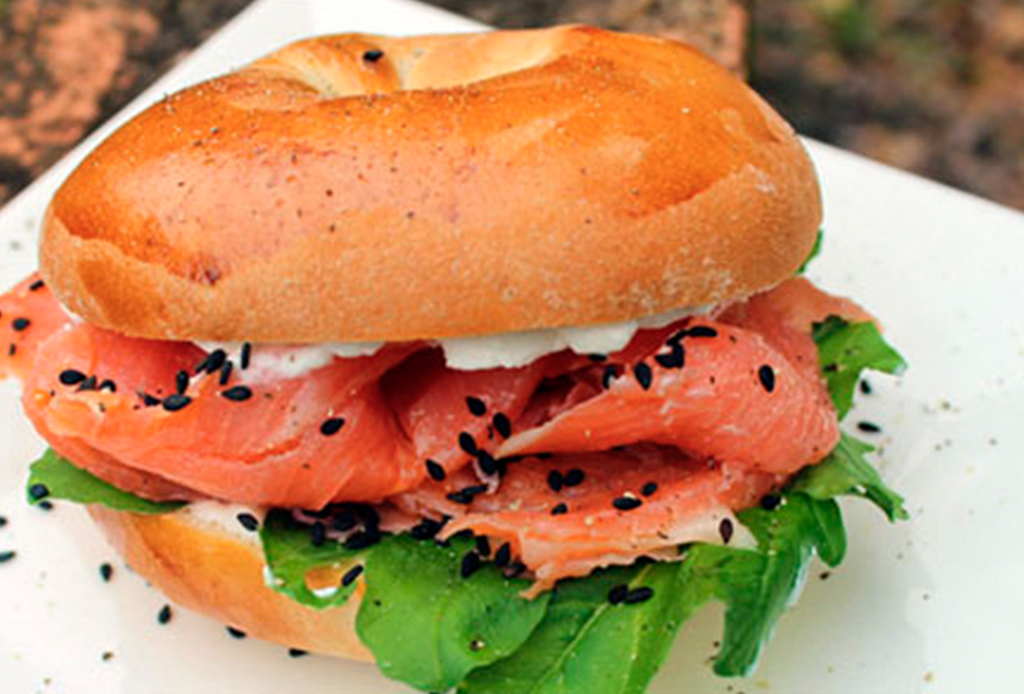 Salmón, queso crema, alcaparras. Se acompaña con ensalada de arúgula.