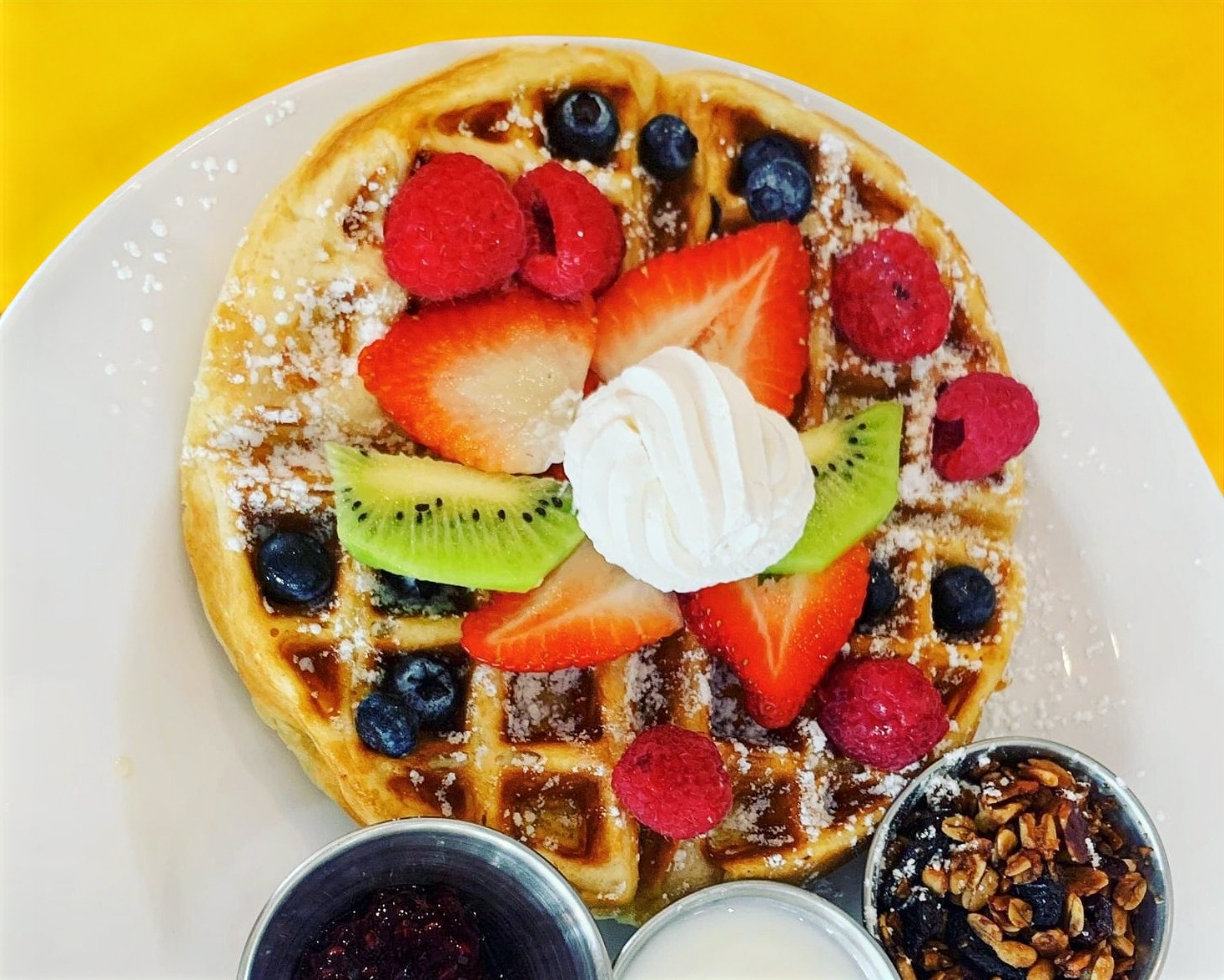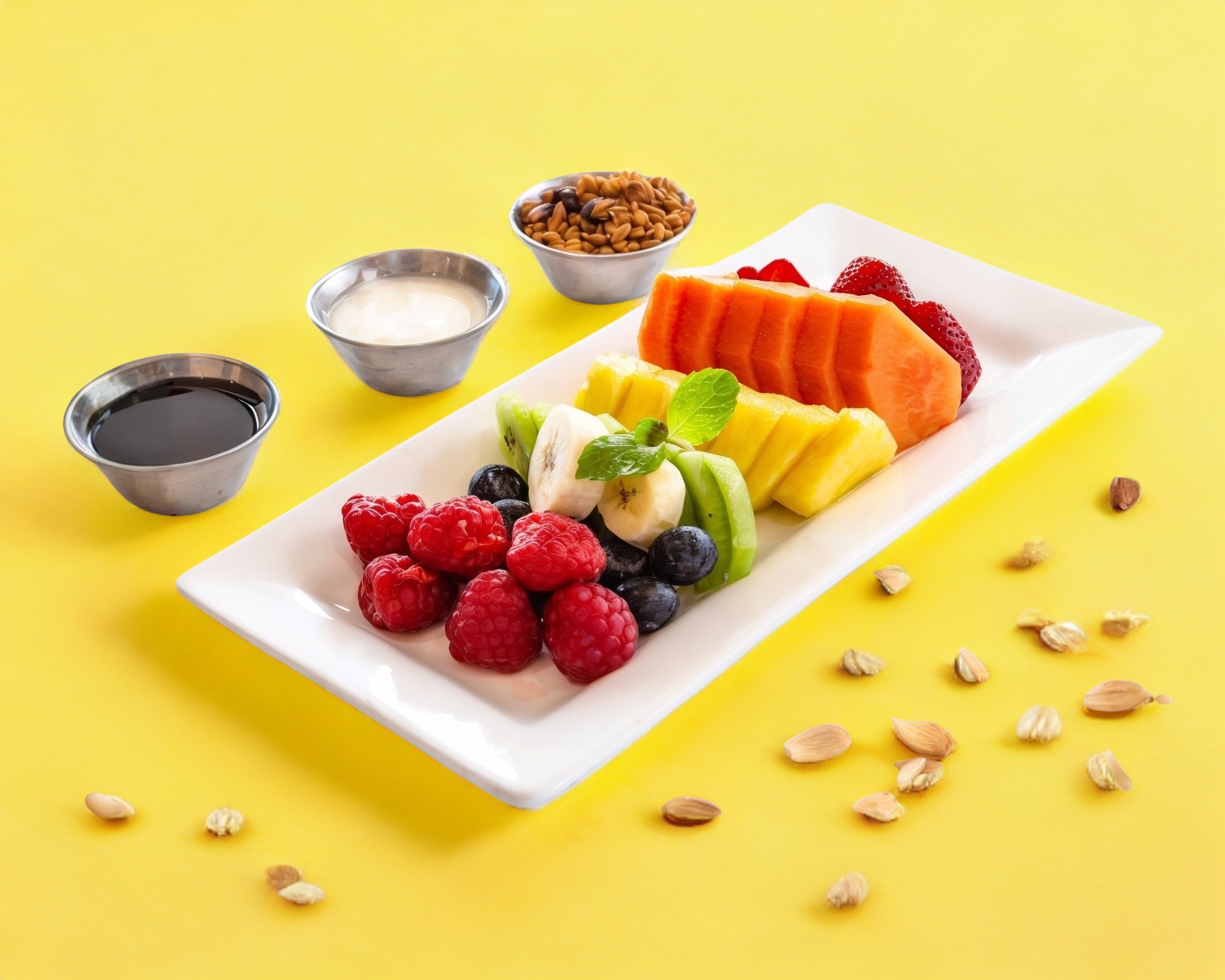 Frambuesa, kiwi, blueberry, plátano, papaya, piña y fresa. Se acompaña con yogur, granola y miel.