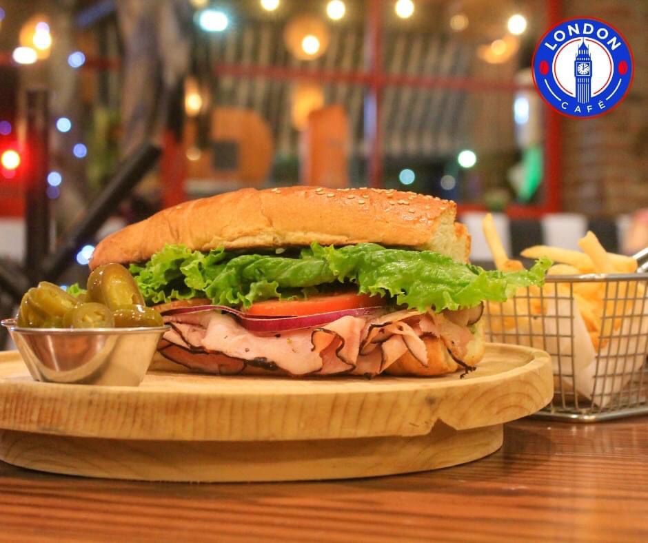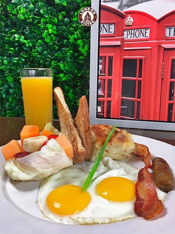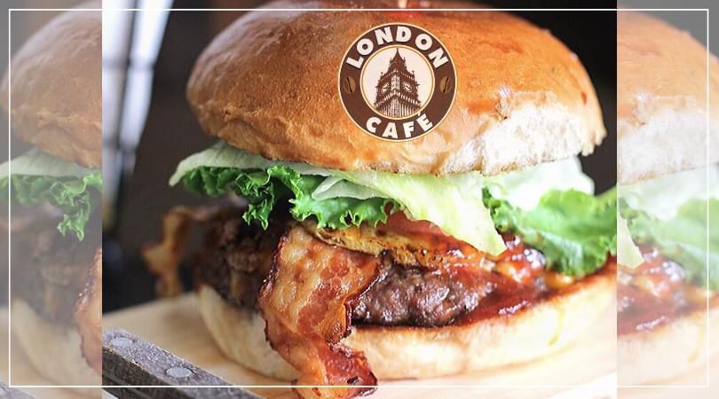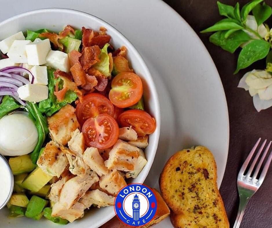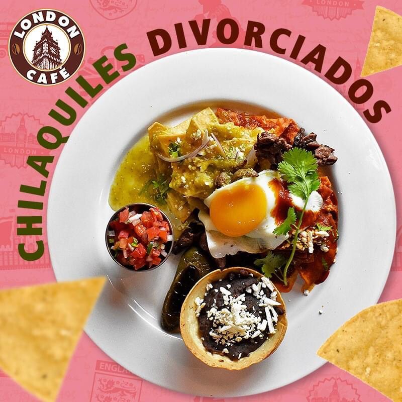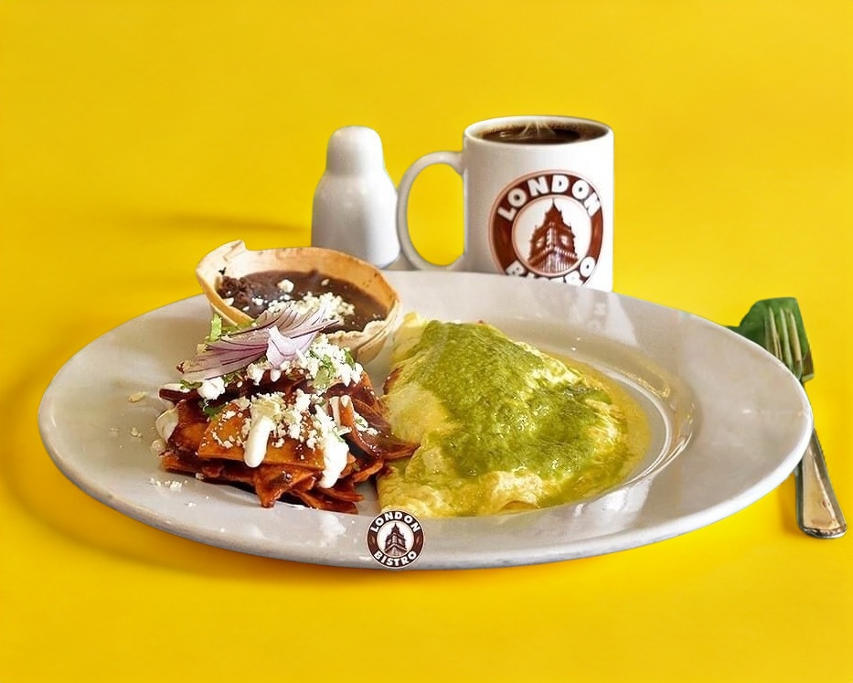 Pechuga de pollo a las hierbas finas, crocante tocino, rajas poblanas, queso oaxaca, cebolla blanca y bañado con salsa london (cremosa salsa al chipotle). Se acompaña con chilaquiles en salsa london o fresca ensalada verde.