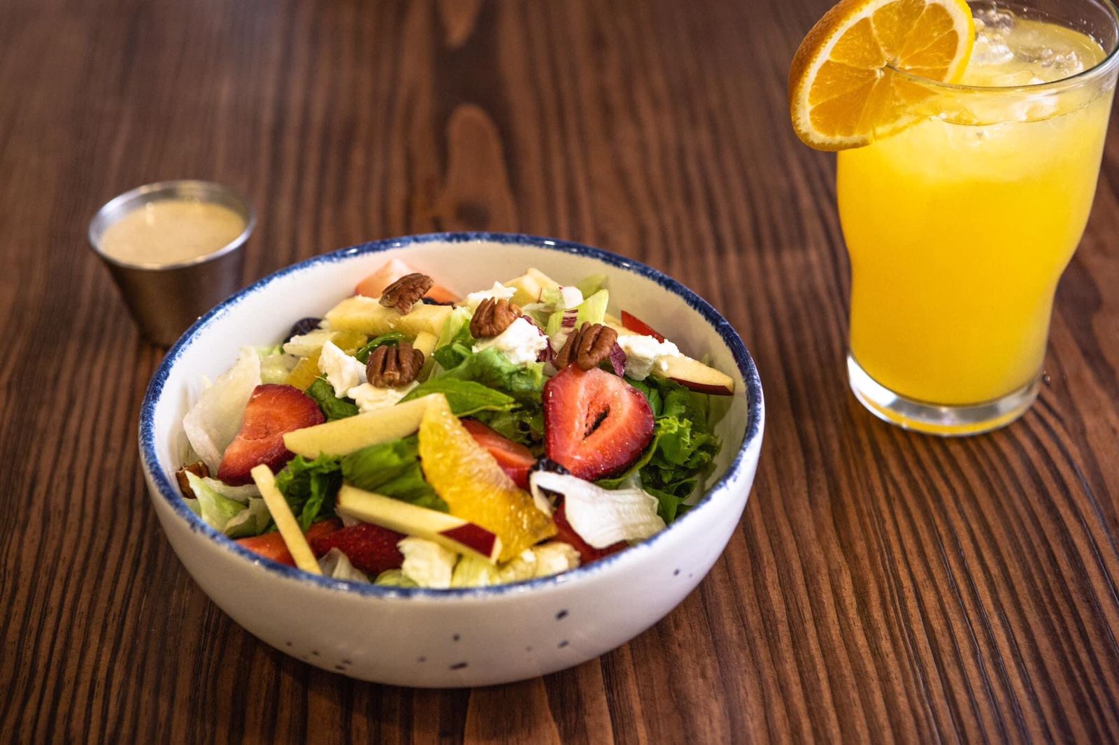 Mezcla de lechuga romana y arúgula, gajos de naranja fresca, arándanos, fresa, nuez, manzana roja y queso de cabra. Servido con aderezo de nuez.