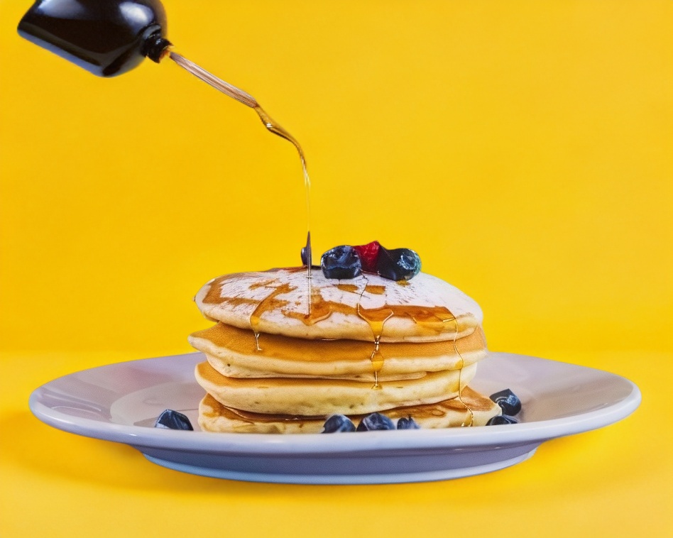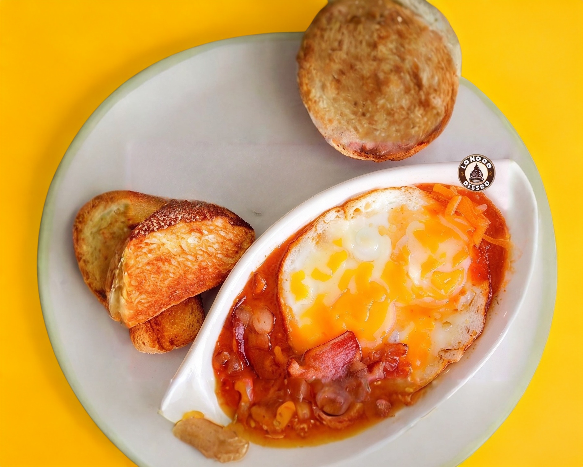 Huevos estrellados montados en una sincronizada de maíz, bañados con rajas poblanas y queso al gratín. Se acompañan con frijoles refritos y papa mil hojas.