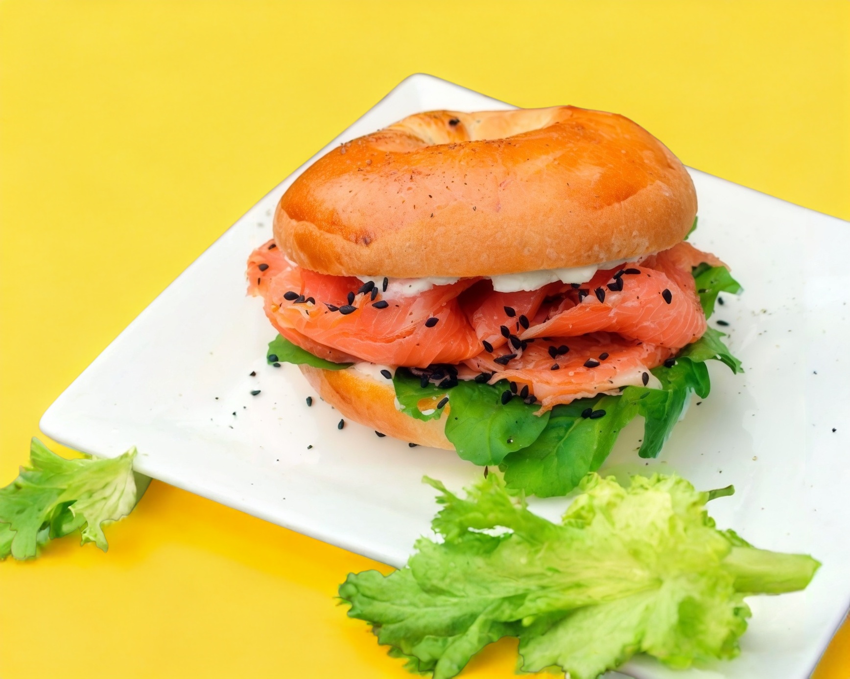 Salmón, queso crema, alcaparras. Se acompaña con ensalada de arúgula.
