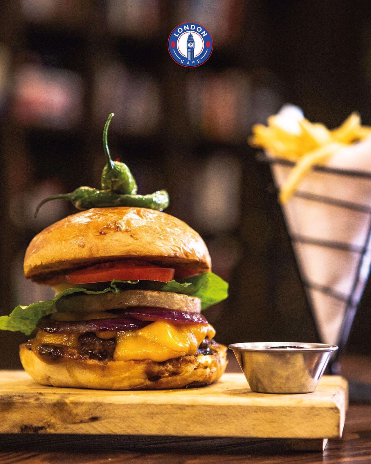 Carne de res, queso cheddar, tocino, lechuga romana, tomate bola, cebolla blanca. Se acompaña de papas a la francesa y chiles jalapeños.