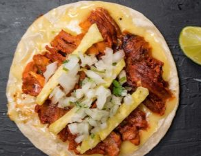 Carne marinada al pastor, queso monterrey jack, guacamole, cebolla curtida con habanero, piña y aderezo chipotle. Acompañada de tomate, cebolla, lechuga, cátsup y mostaza.