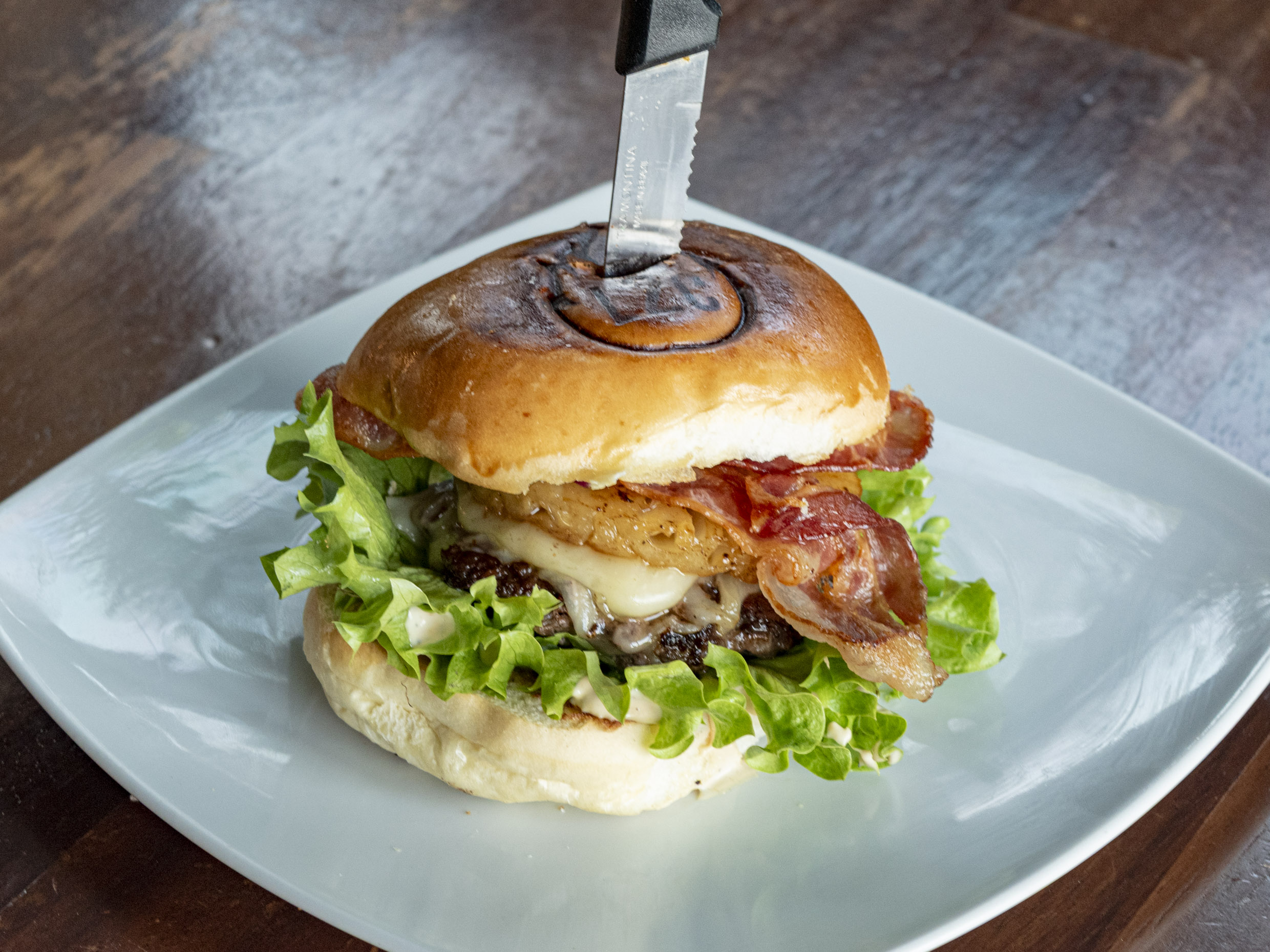 Carne sirloin marinada con rub de BBQ, queso Monterrey, tocino y salsa BBQ y pepinillos. Acompañada de tomate, cebolla, lechuga, cátsup y mostaza.