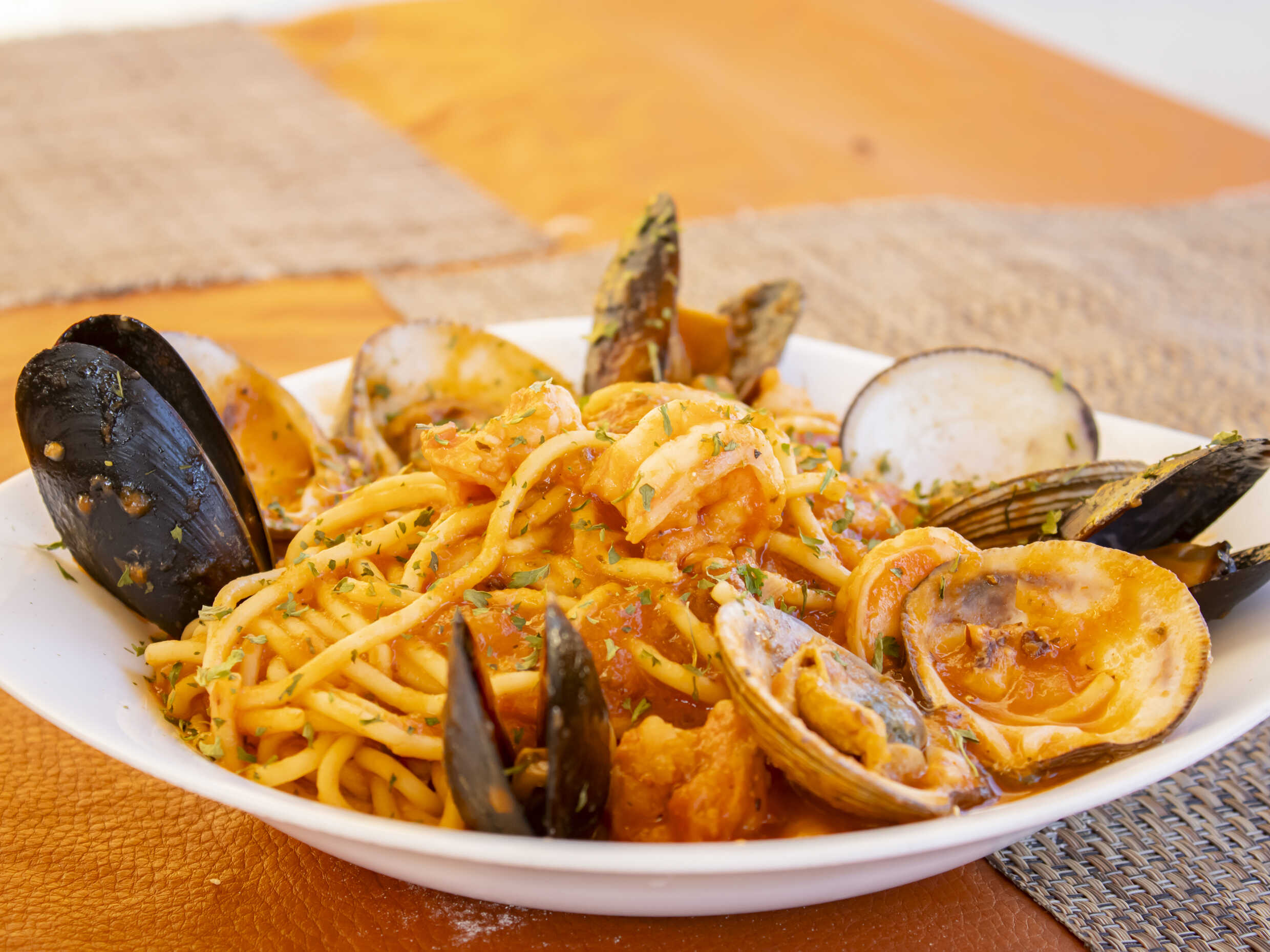 Salsa de tomate, vino blanco, chile quebrado, ajo, camarón, pulpo, mejillón y almeja.