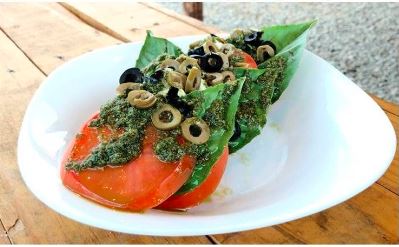 Queso mozzarella, tomate, albahaca, pesto y aceitunas.