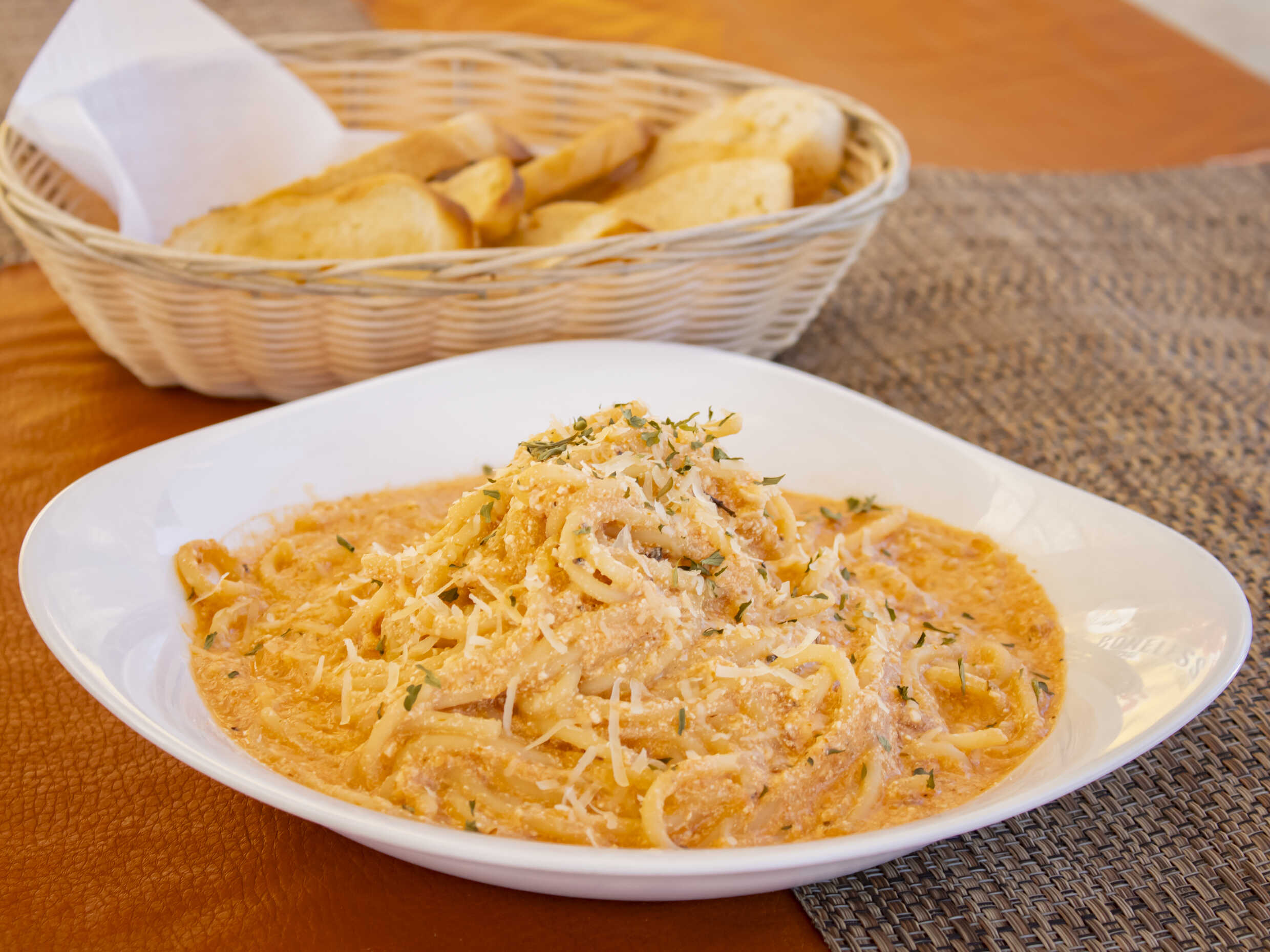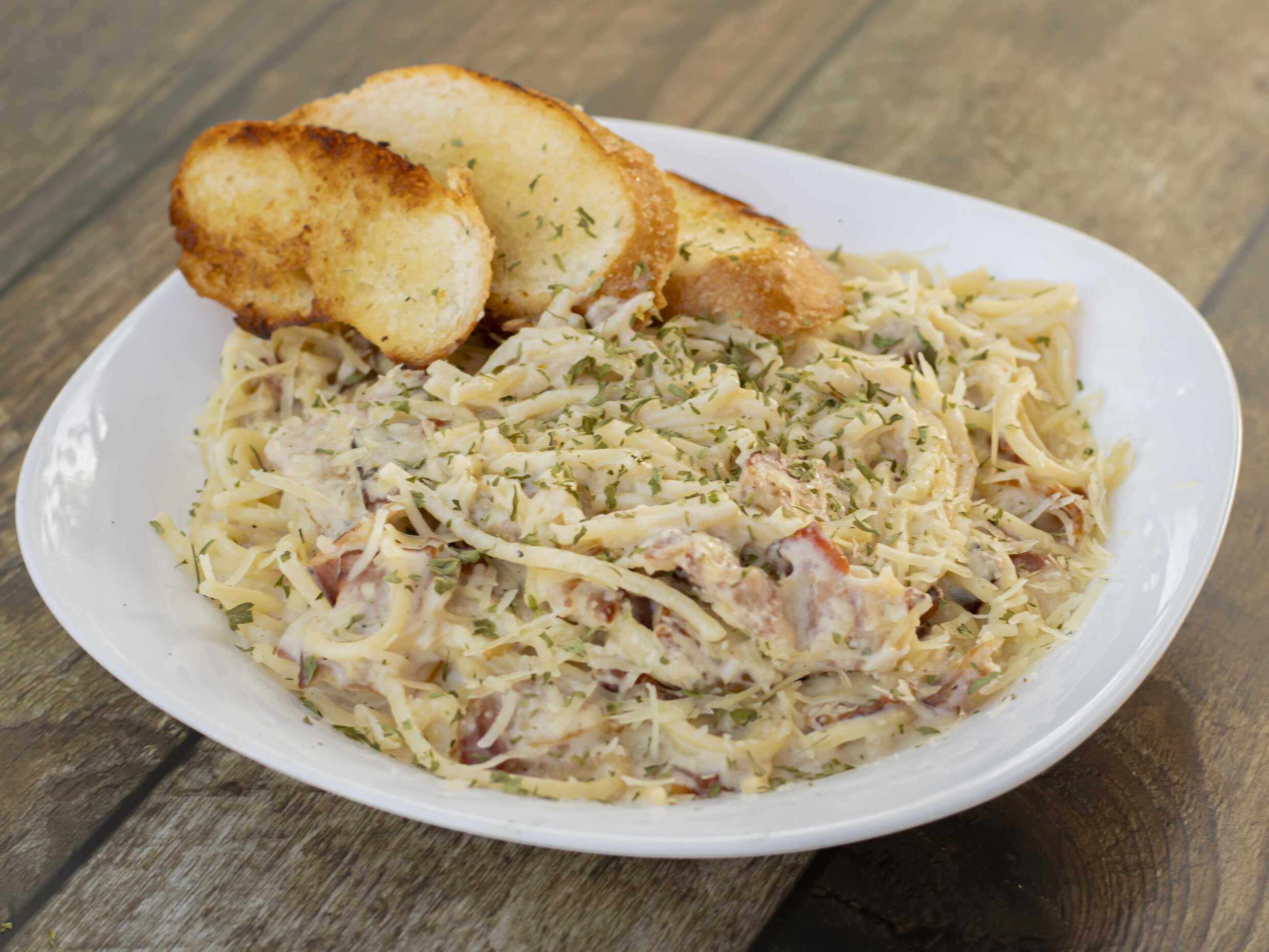 Salsa blanca, tocino, parmesano, perejil. Acompañado de pan con aceite de oliva y ajo.